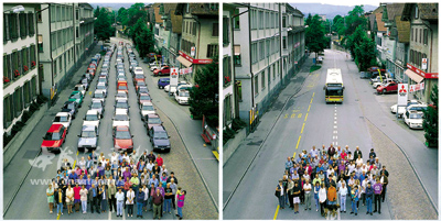 | (左图)如果不采用巴士快速交通系统,城市的道路是多么拥挤。(右图)采用了巴士快速交通系统,城市的空间也显得大了。人还是那么多,人居的环境却大为改观。先进的城市公交系统,确实值得我们好好学习借鉴。 |