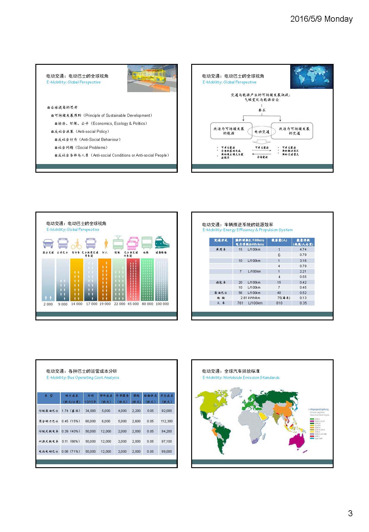 我们的电动巴士很多都是把原来的柴油发动机取掉,换上电池,再换一个工业电机来驱动轮,这是一种传统的方式,只是为电动而采用电池作为动力。如果我们认真考虑,像飞机的分布式推进系统会提高效率和降低成本,飞机都可以用分布式推进系统,汽车为什么不用四个轮子来驱动呢?在汽车工程学上来讲,四个轮子来驱动不是效率最高!公共交通电动化一定结合行业特征,就会找到最基本的好方法。所以,从全球的角度,我们来思考一下公共交通电动化,首先要遵循可持续发展的三原则,公共交通一定要可持续发展。
