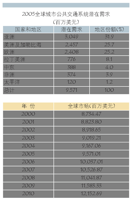 概括地说,全球城市公共交通系统的年需求量大约为957100万美元(2005年)。亚洲无疑是最大的潜在市场,约占全球市场份额的32%;北美及加勒比海地区、欧洲分别占全球市场25%的份额,拉丁美洲占8%,中东和非洲分别为1%、太平洋为1%。中国已成为亚洲城市公共交通系统的最大潜在市场,约占亚洲市场份额的34%;上海、北京和重庆3个大城市的城市公共交通系统分别占据中国市场份额的1%以上,并位列全球排名榜上前10位。