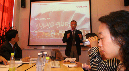 2005年6月22日(星期三)上午,步履杰米·勒纳先生的后尘,我来到向往已久的沃尔沃客车分部,在一楼左侧的会客区,也许就是杰米·勒纳先生当年来访使用国的会议室,沃尔沃客车分部的高级副总裁儒恩·伦德伯格(Rune Lundberg)先生和沃尔沃客车印度公司副总裁阿卡什·帕西(Akash Passey)先生一起,向来自亚洲四国的媒体记者介绍了沃尔沃客车的发展情况,并接受了记者们的提问。