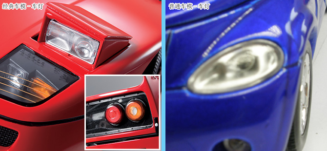 这些涉及模型玻璃塑料的质量和做工水准。中高档模型对玻璃塑料的要求自然是严格的,透过车窗都可以清晰地看到汽车内饰细节;而在车灯的设计上,中高档模型全部要经过镀烙处理,增强车灯的透明度和反光度,而且车灯和车体的几乎没有间隔,浑然一体。