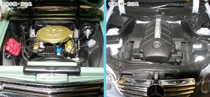 这是很多模型爱好者都会注意的细节,因为发动机是汽车的心脏。中高档的模型产品对发动机的设计自然是一丝不苟,除了对外形严格按照原车发动机设计外,还能看到气缸盖上的标识,而电路、油路、冷却系统、进排气道、风扇同样被独立而细致地表现出来;顶级车模对发动机的再现更让人叫绝,全部采用于原件相似的材料而不仅仅是单一的塑料,让你充分感受发动机的魅力。